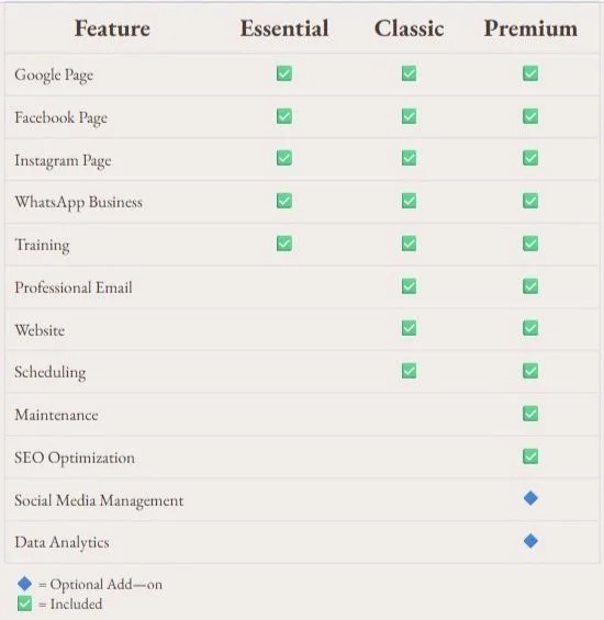 Build a digital presence with clarity and confidence. Each service tier offers tailored support for every stage of business — from setup and refinement to advanced tools for growth.